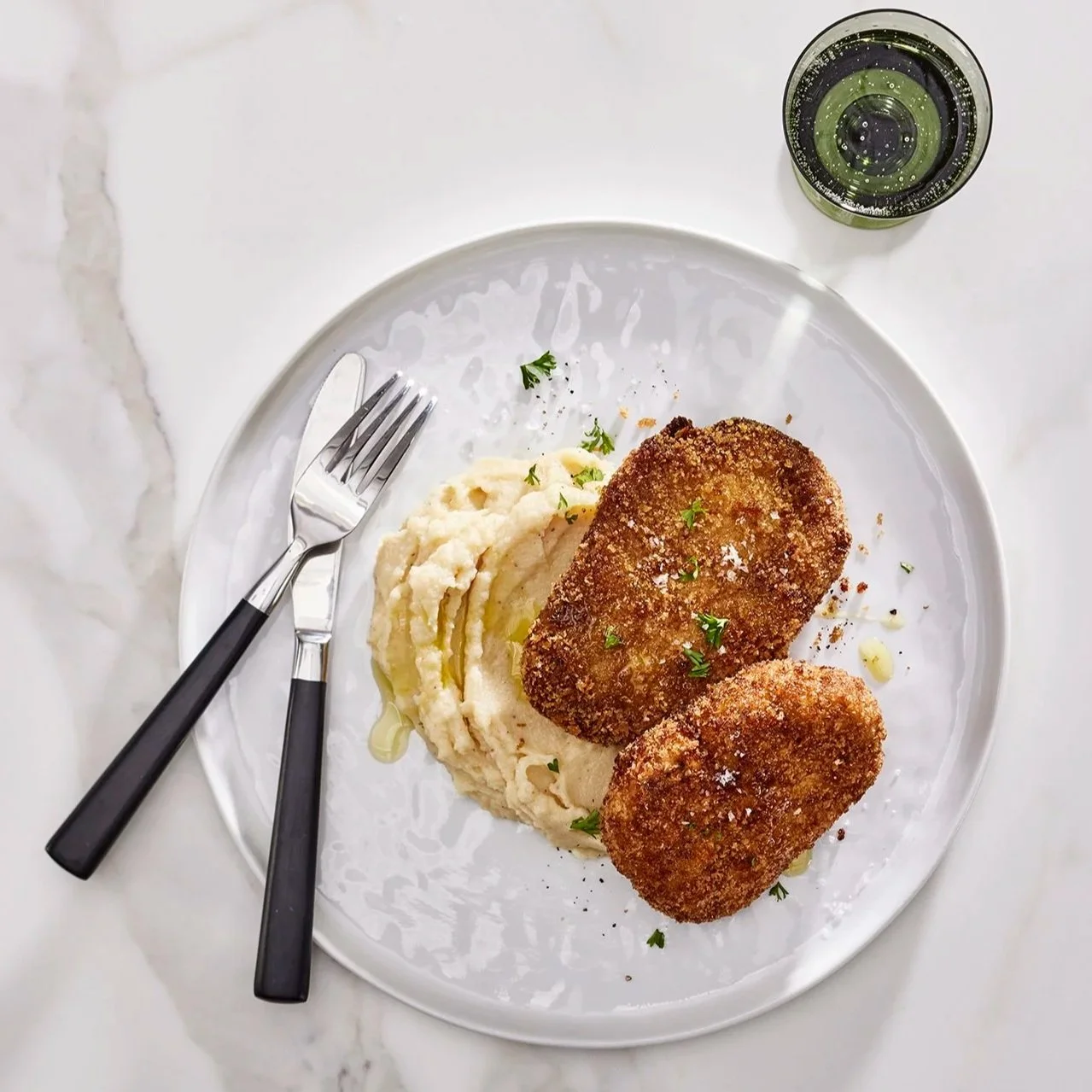 To prepare the schnitzel, dredge each pressed mushroom cutlet in flour mixture, then egg mixture, and finally in seasoned panko. Heat 1 inch cooking oil over medium heat and pan fry cutlets for 3 to 4 minutes each side, until cooked through and crispy.