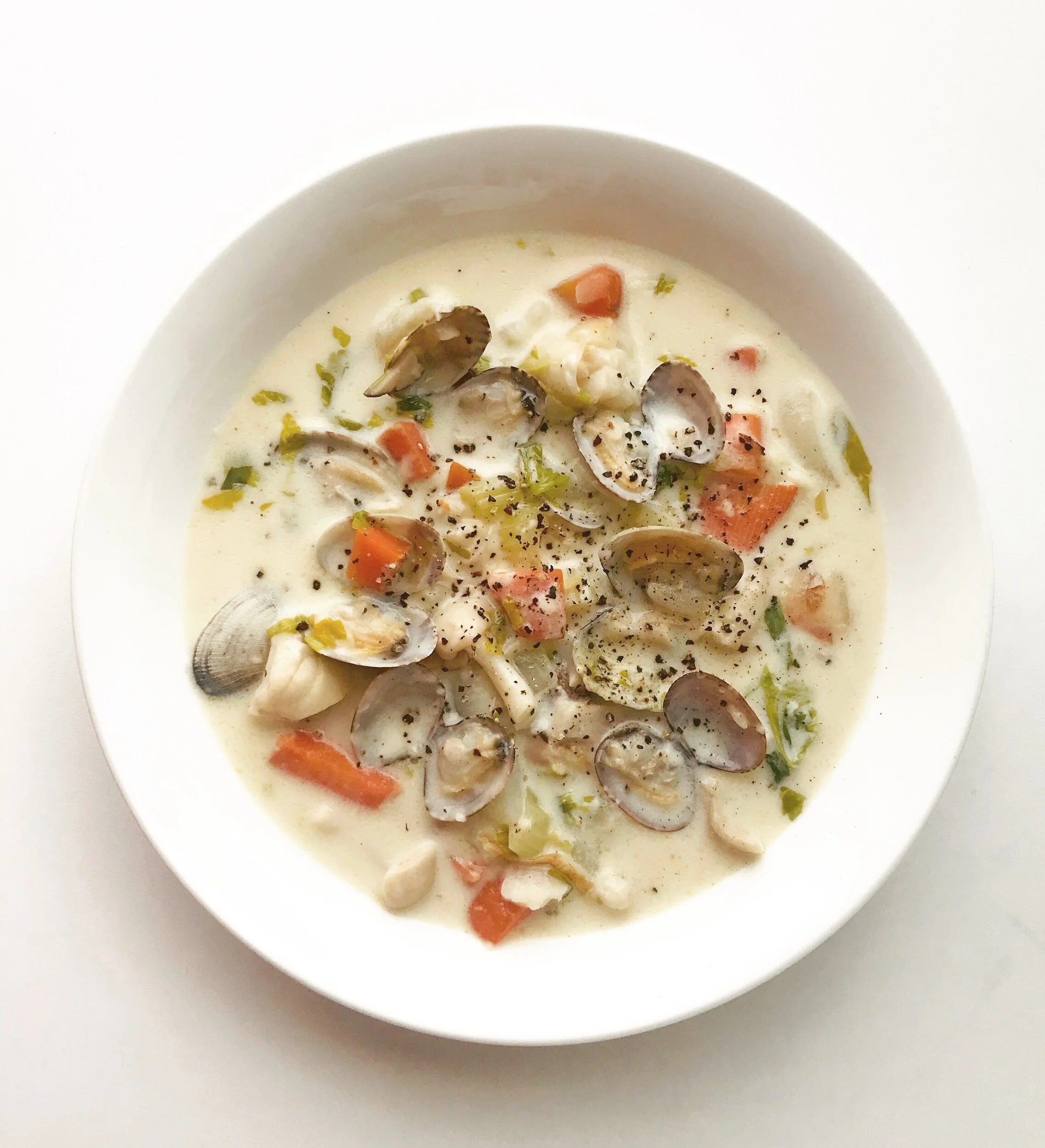 Fish chowder is the type of dish you might find in England at a country pub or in a fishing village. But the addition of clams and intensely flavourful sweet corn makes this particular chowder unmistakably delicious. With its hearty vegetables, bacon, potatoes and cream, a great dish for the holiday table.