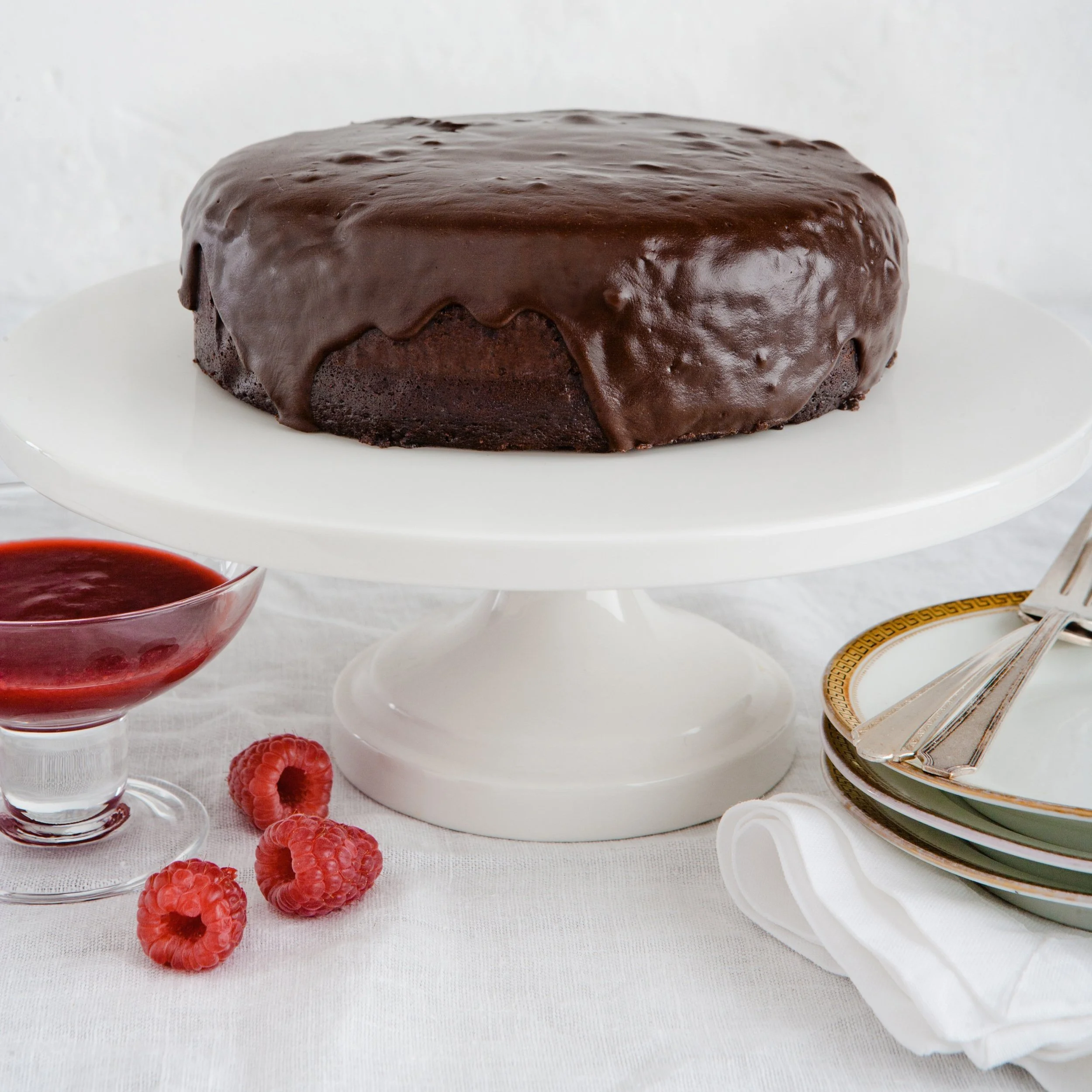 For glaze, melt chocolate with butter in bowl over simmering water. Remove from heat and whisk in corn syrup. Continue to whisk until smooth. use glaze warm. To assemble, place cake on wire rack over large baking sheet. Slowly pour warm glaze over centre of cake. Glaze will cover surface and spill evenly over edges and down sides. Chill until ready to serve. Serves 8.