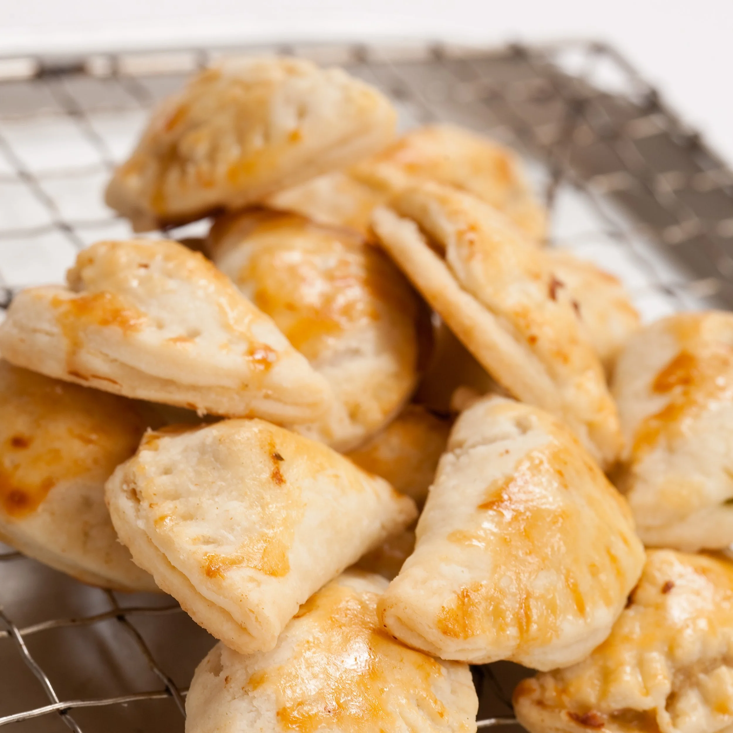 To assemble, place one pastry round onto lightly floured surface; roll to 1/8-inch thickness. using 3-inch round cookie cutter, cut into rounds. Place onto parchment lined baking sheet and chill 30 minutes. Preheat oven to 350°F. Place one teaspoon filling in center of circles; fold circles in half. Pinch edges with fork dipped in flour to seal. Brush tops with egg wash. Bake 15 to 20 minutes or until golden. Transfer to cooling rack. Store in airtight container in freezer up to one month. Makes 36 to 48.