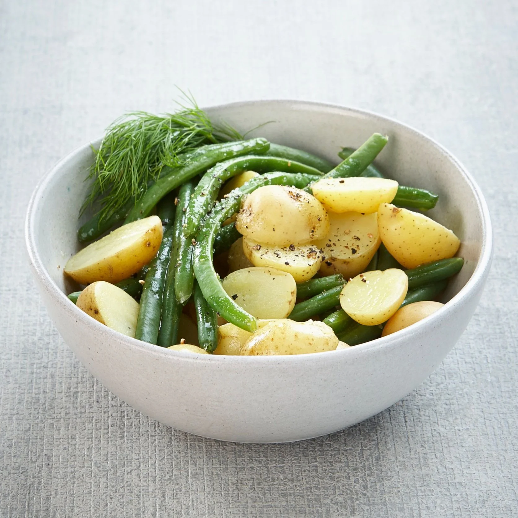 In medium pot, cover potatoes with cold water and add 1 teaspoon salt. Bring to boil over medium-high heat and cook for 8-10 minutes, or until easily pierced with a knife. Add green beans and cook for 1 more minute, until beans are just tender.