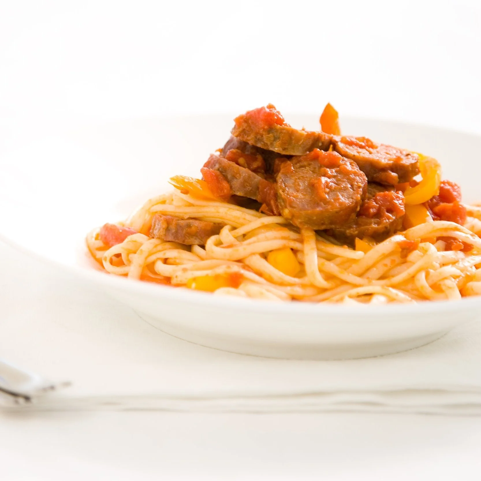 Prepare pasta according to package directions and remove suasage from oven. In heavy saucepan, heat 2 tablespoons extra-virgin olive oil and saute peppers on medium heat for about 2 minutes, then add to pureed sauce. Slice sauge and add to sauce. Drain pasta and toss with sauce, peppers and sausage. Serve immediately. Serves 6-8.