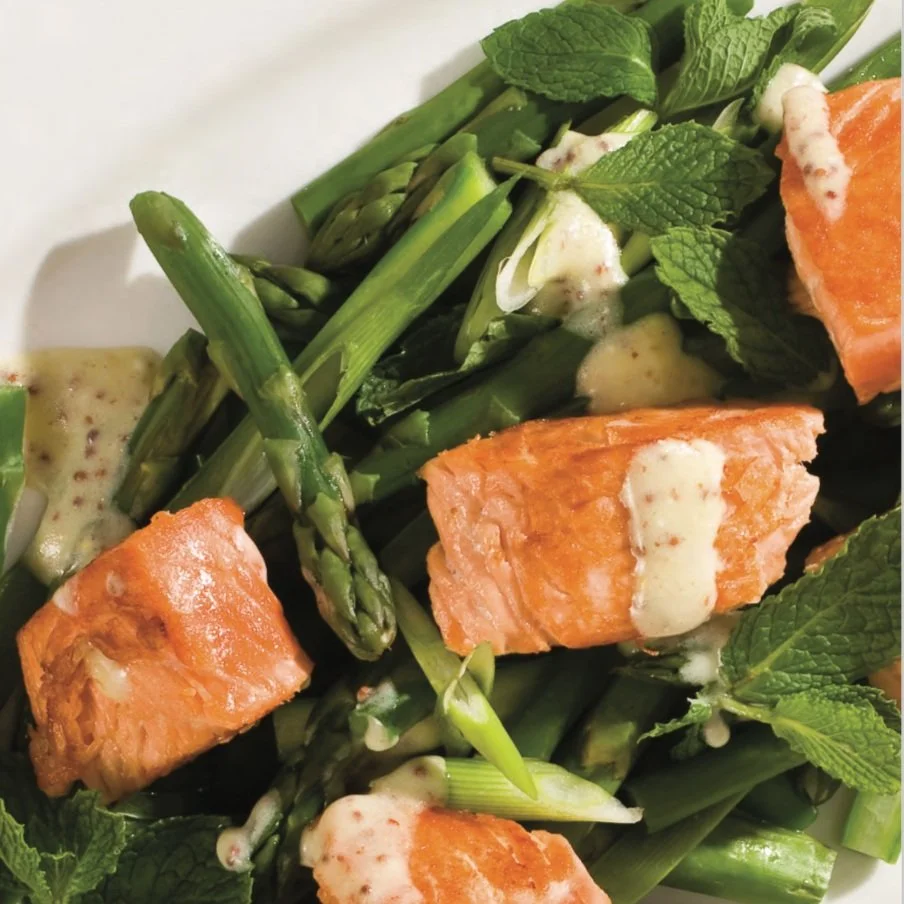 To assemble, arrange equal amounts of sugar snaps, asparagus, green onions and mint on 4 plates. Top with salmon. Drizzle with dressing.