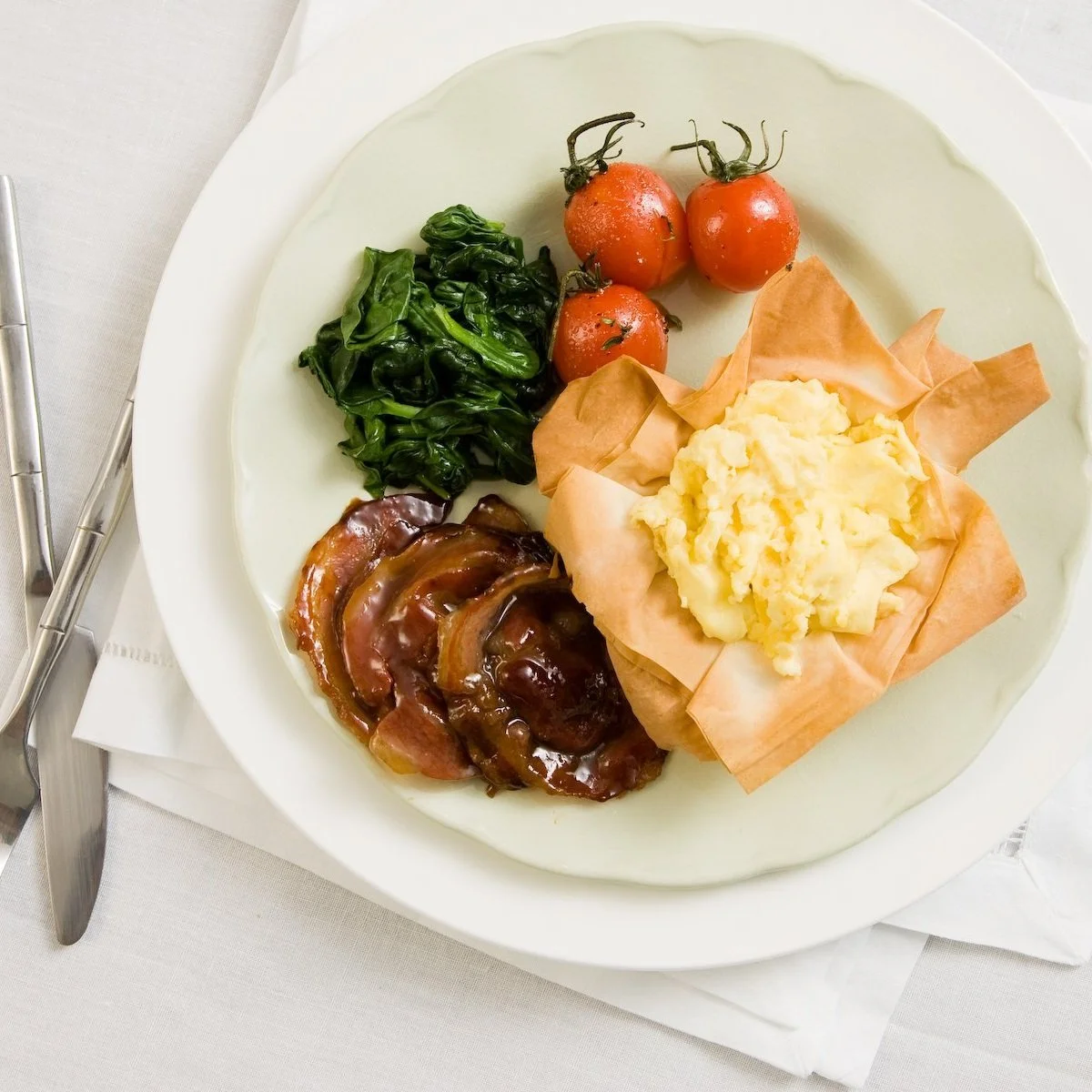 To assemble, place phyllo cups on serving plates and fill with scrambled eggs. Divide tomatoes, pancetta and spinach evenly on each plate. Serve immediately. Make 4 servings.