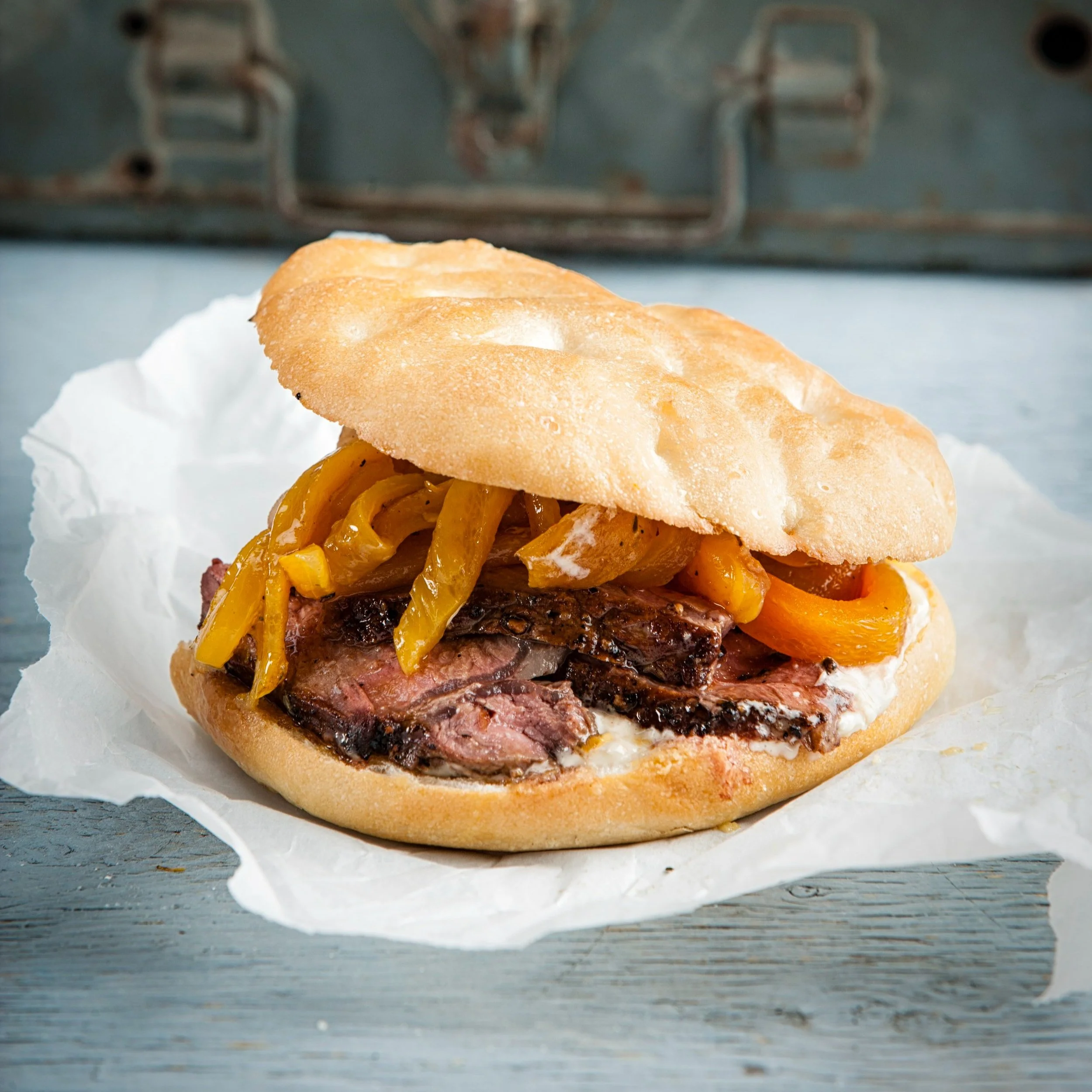 Lunch or dinner, hot or cold, this savoury steak sandwich recipe comes together in no time–if you sear the meat and prepare the peppers in advance. Delicious!