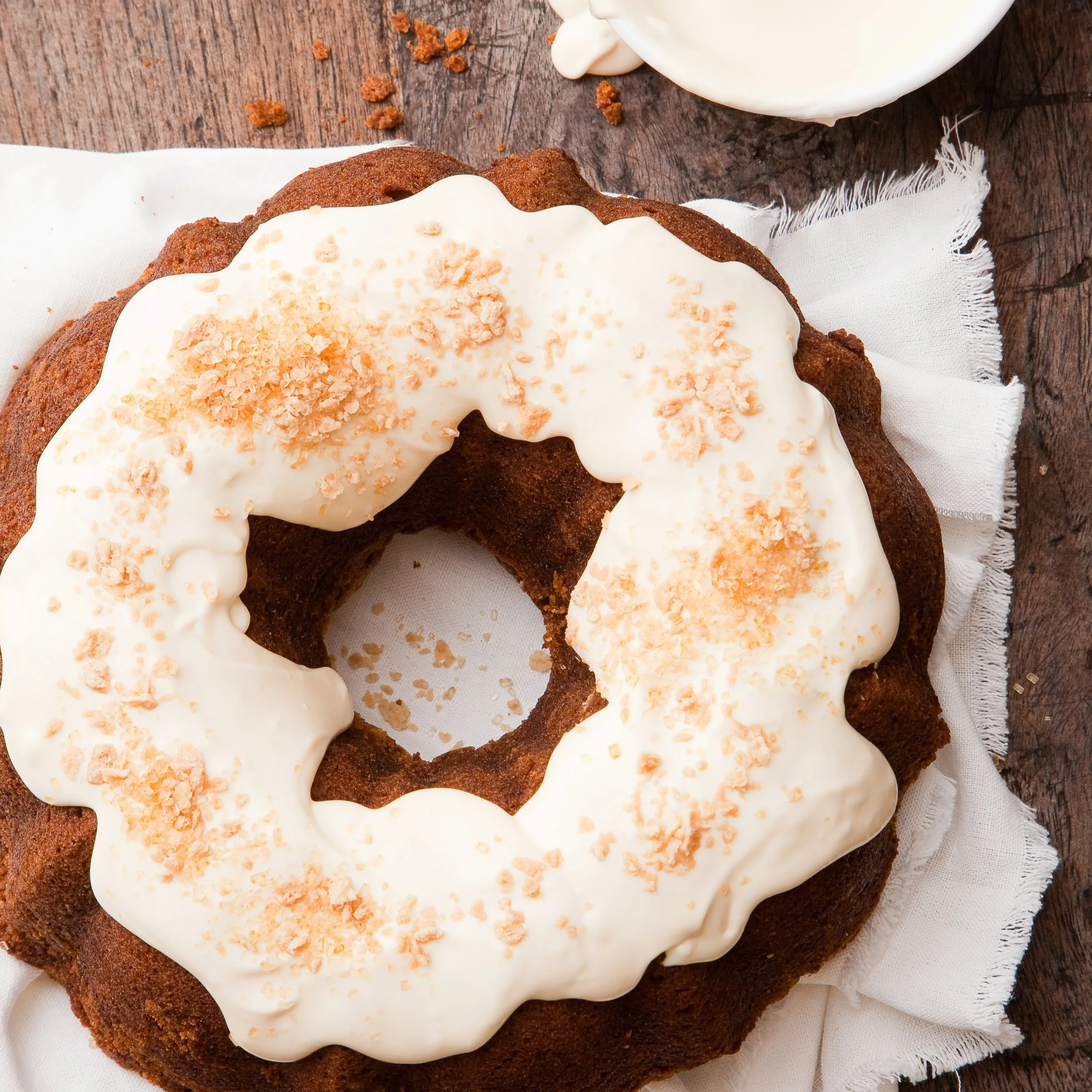 Our comforting pumpkin cake is draped in maple cream cheese and a perfect way to start your day.