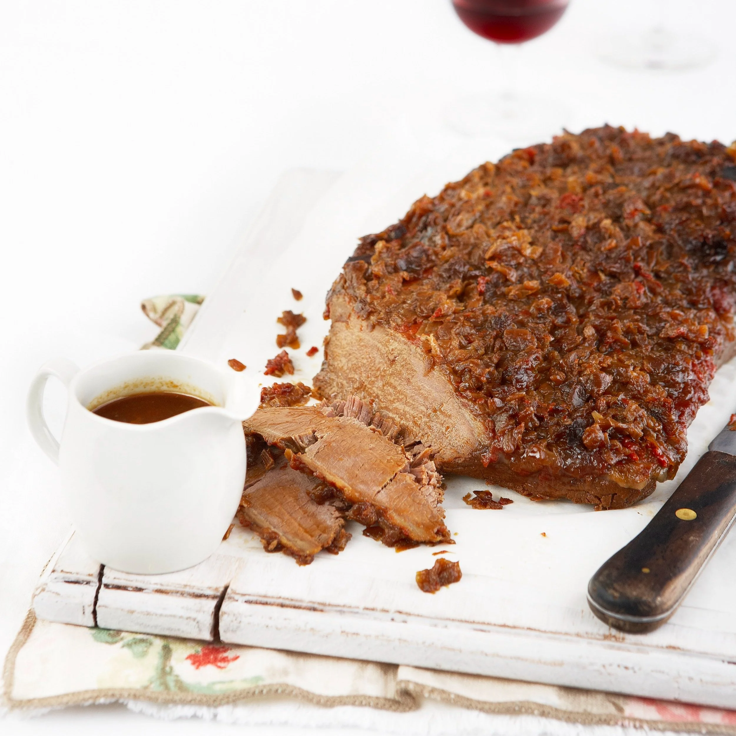 In small bowl, combine brown sugar and ketchup. Lay brisket in a roasting pan. Season on all sides with salt and pepper, coat with ketchup mixture. Top brisket with caramelized onions. Cover with aluminum foil and refrigerate overnight.