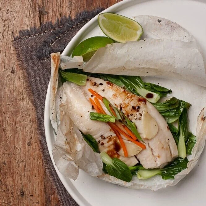 A perfectly light and delicious fish and boy choy with ginger and garlic. So easy and lovely to serve wrapped in parchment.