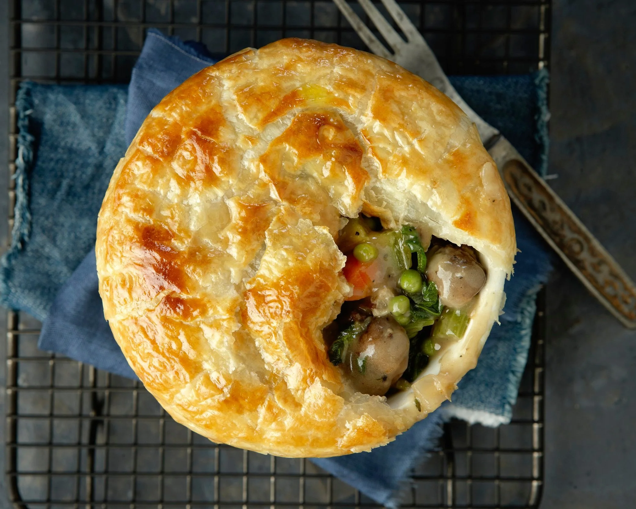 These savoury vegetarian pot pies can be made ahead and frozen unbaked. Just bake from frozen at 350°F for about an hour.