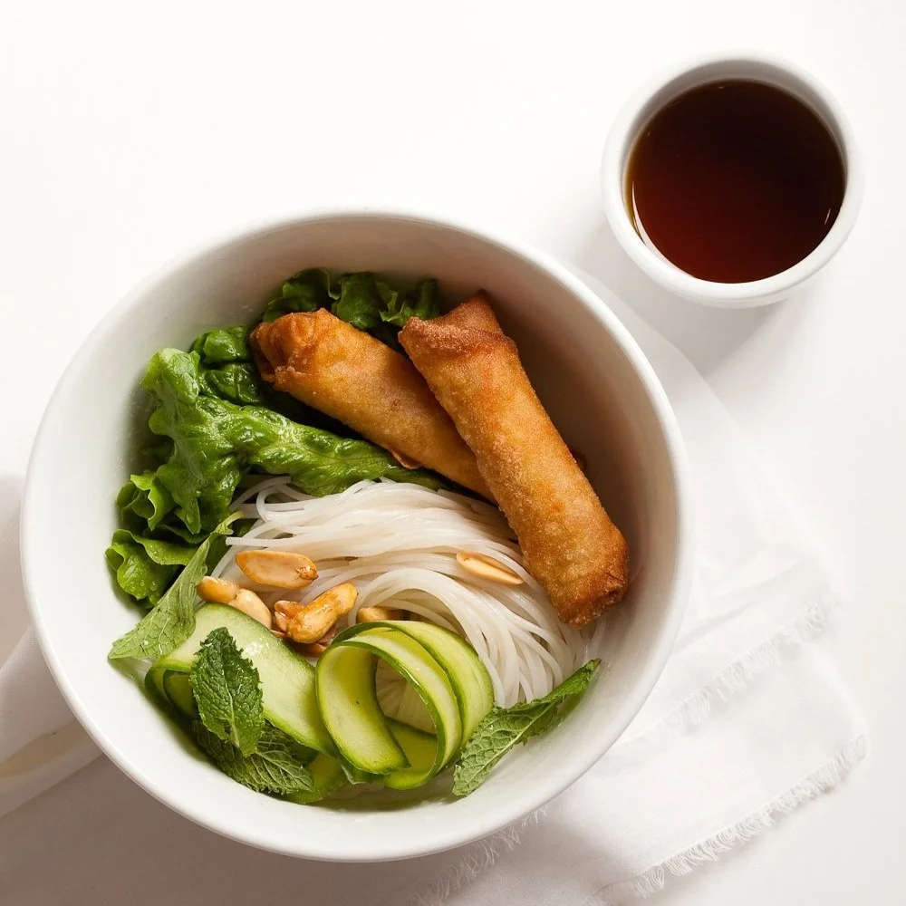 Vermicelli Bowl with Cucumber, mint, peanuts, and Spring roll