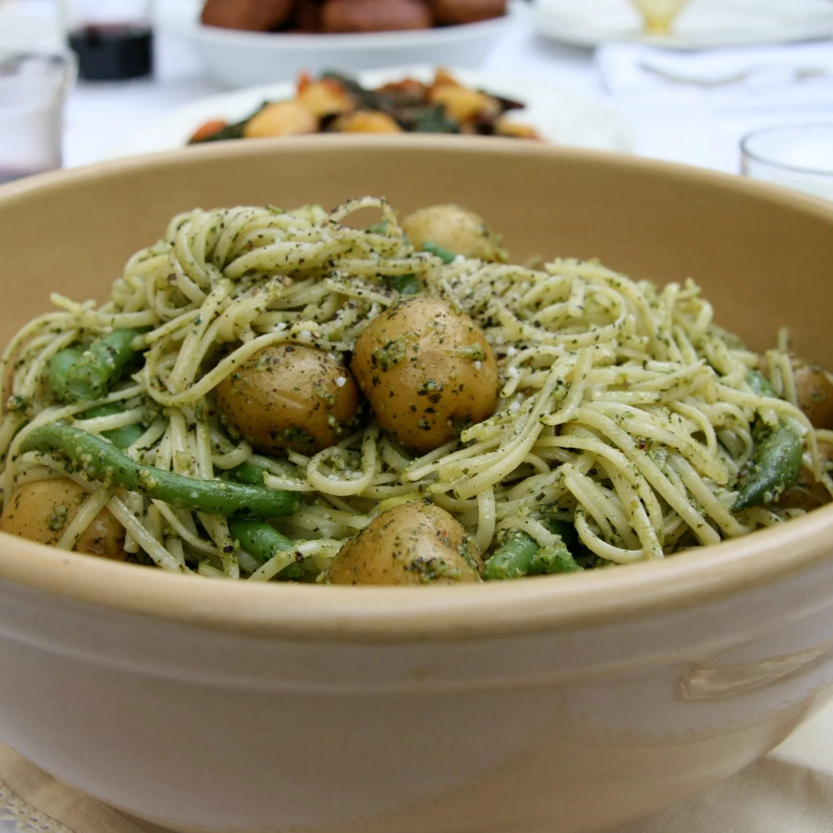 Luscious walnut pesto with al dente cooked pasta, fresh green beans, and new baby potatoes transforms humble ingredients into a spectacular meal.