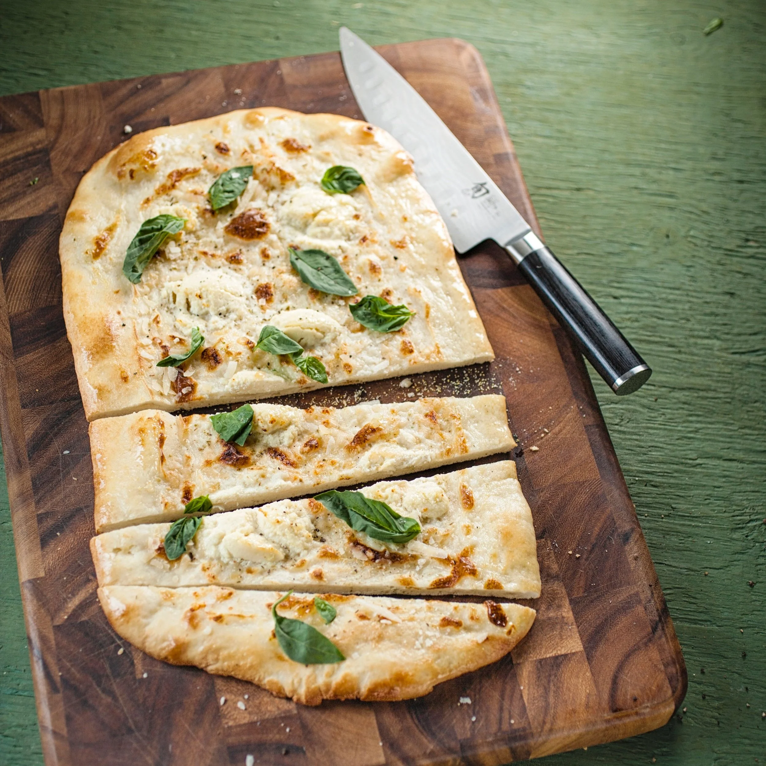 This beautiful pizza is garlicky and herbaceous. Served as a starter, or an entrée with our kale Caesar, this recipe is so delicious.